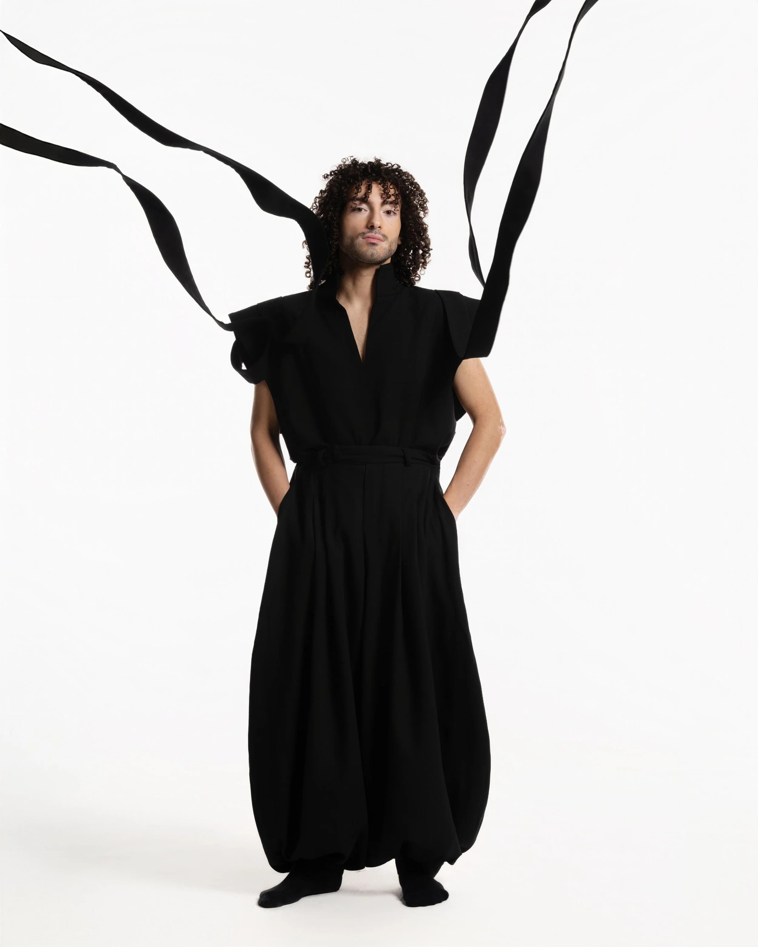 Black: Mourning as a practice of control. Tailored wool expresses grief, caught between the desire for release and the restrictive forces of cultural censorship.