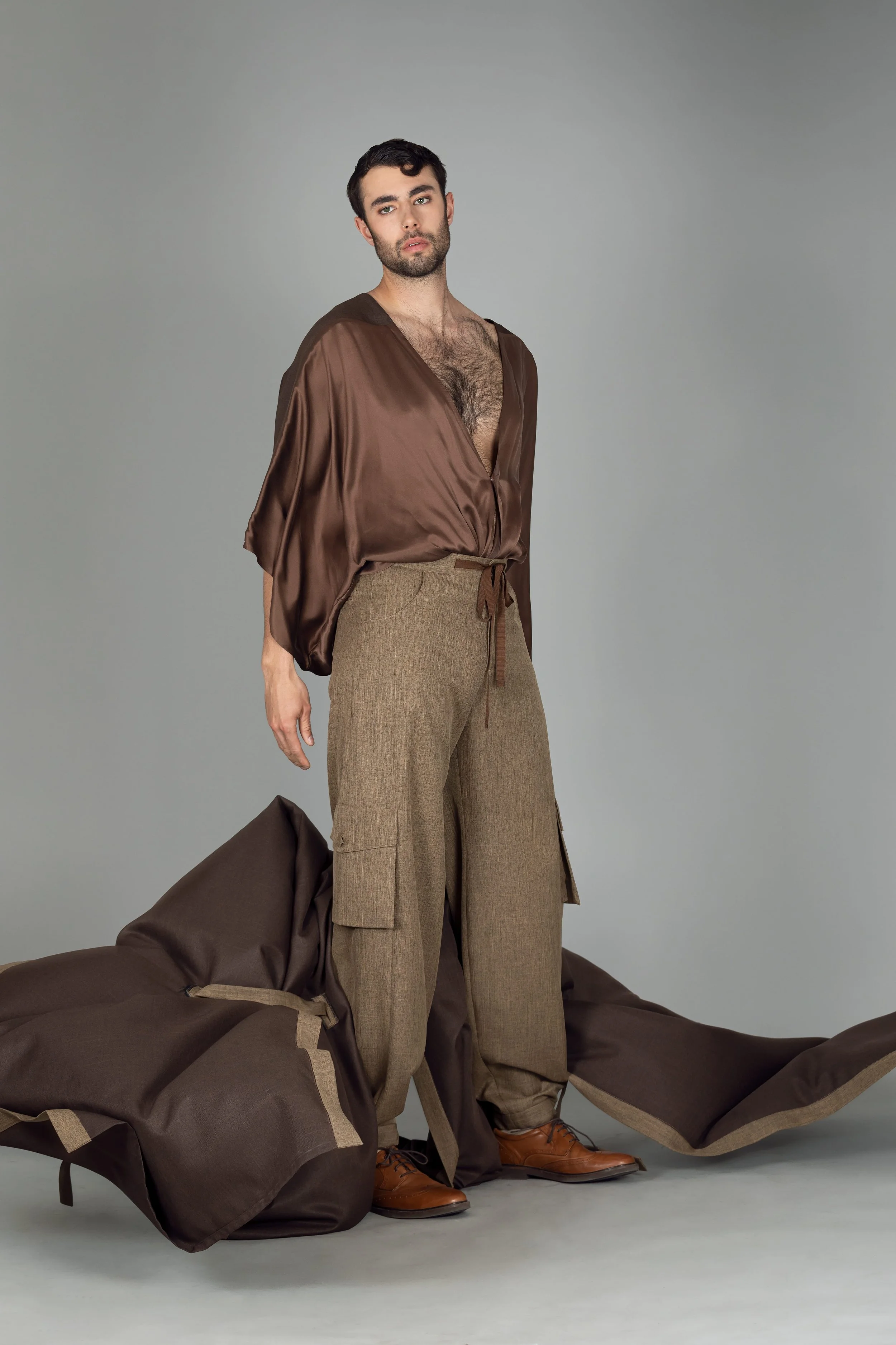 The ensemble harmoniously assembles three distinct elements: trousers crafted in the likeness of laborer's attire, deliberately designed for comfort and ease of movement; a silk kimono, draped gracefully to enable unbridled motion and an infusion of refreshing airflow; and a poncho reminiscent of the traditional Abaya that once adorned men of yore.